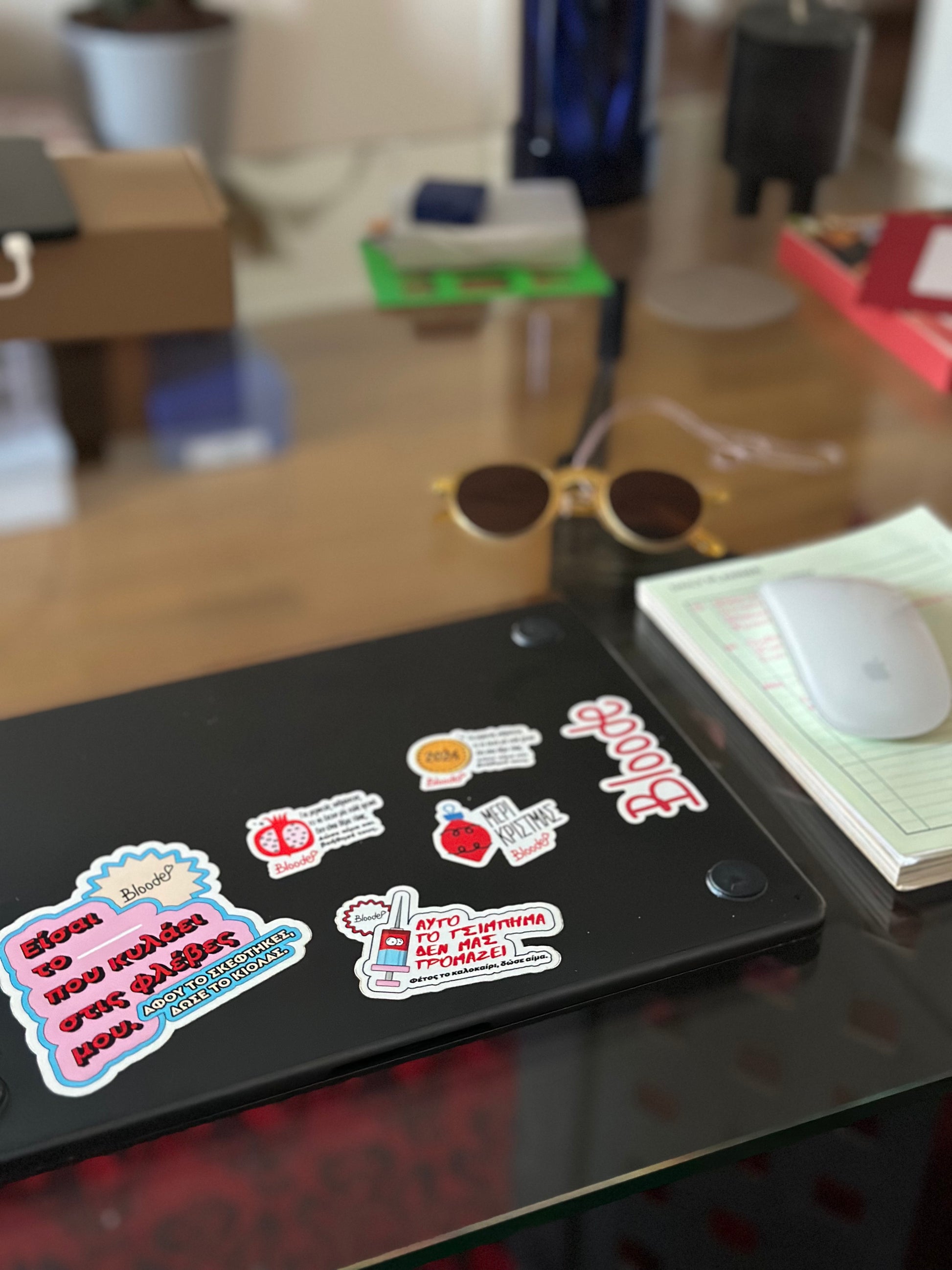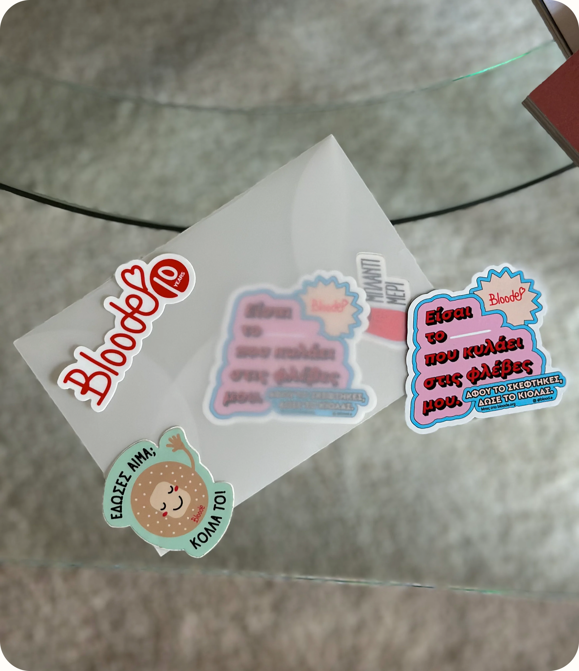 Ένας διασκεδαστικός τρόπος να μεταδώσεις ένα δυνατό μήνυμα! Το Bloode Sticker Pack περιλαμβάνει 3 ή 5 μοναδικά αυτοκόλλητα με εμπνευσμένες και έξυπνες φράσεις που ενθαρρύνουν την αιμοδοσία. Ιδανικά για το λάπτοπ, το παγούρι, το σημειωματάριο ή όπου αλλού θέλεις να αφήσεις το αποτύπωμά σου.